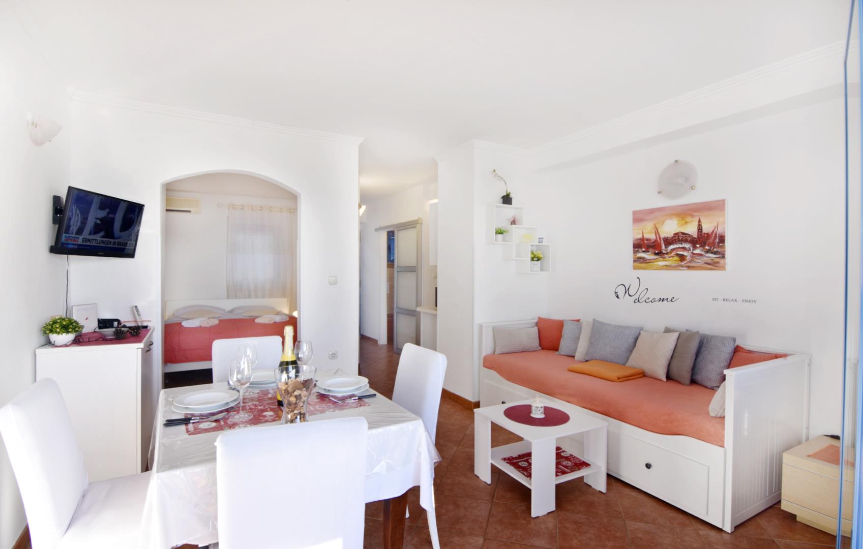 Mali, ali funkcionalan smještaj, na mirnom mjestu okruženom zelenilom sa bočne strane ulaza i prekrasnim pogledom na more s balkona.