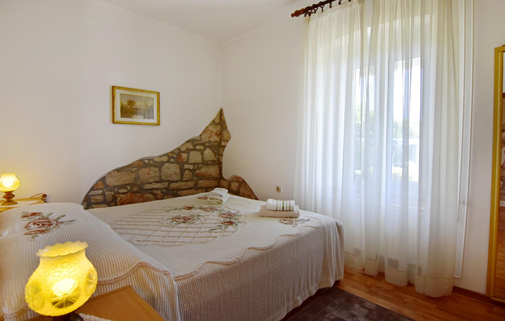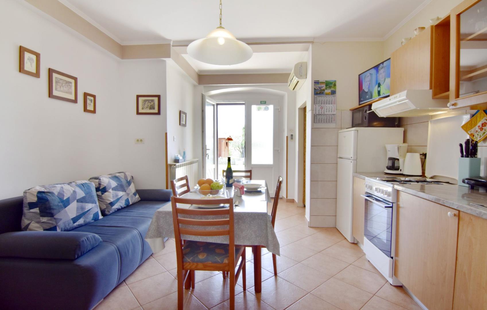 Apartman nudi spavaću sobu s bračnim krevetom (160x200), 2 noćne svjetiljke, posteljinu (mijenja se tjedno), ormar, komodu, satelitsku TV s ravnim ekranom, besplatnu Wi-Fi internet vezu. U dnevnom dijelu trpezarijski stol i tri stolice, kauč na razvlačenje za jednu osobu. Opremljena kuhinja s hladnjakom s zamrzivačem, aparatom za kavu, kuhalom za vodu, mikrovalnom pećnicom, 3 plinska plamenika i električnim otvorom. Kupaonica s tušem, WC, umivaonik sa ogledalom, sušilo za kosu, dva ručnika za kupaonicu po osobi (mijenjaju se tjedno). Postoji mala terasa i neovisan ulaz. Mala terasa (veranda) opremljena stolom i stolicama na kojima ujutro možete uživati ??u kavi ili navečer u dobroj čaši istarskog vina. Smještaj je opremljen svime što vam treba za odmor u punom komforu.