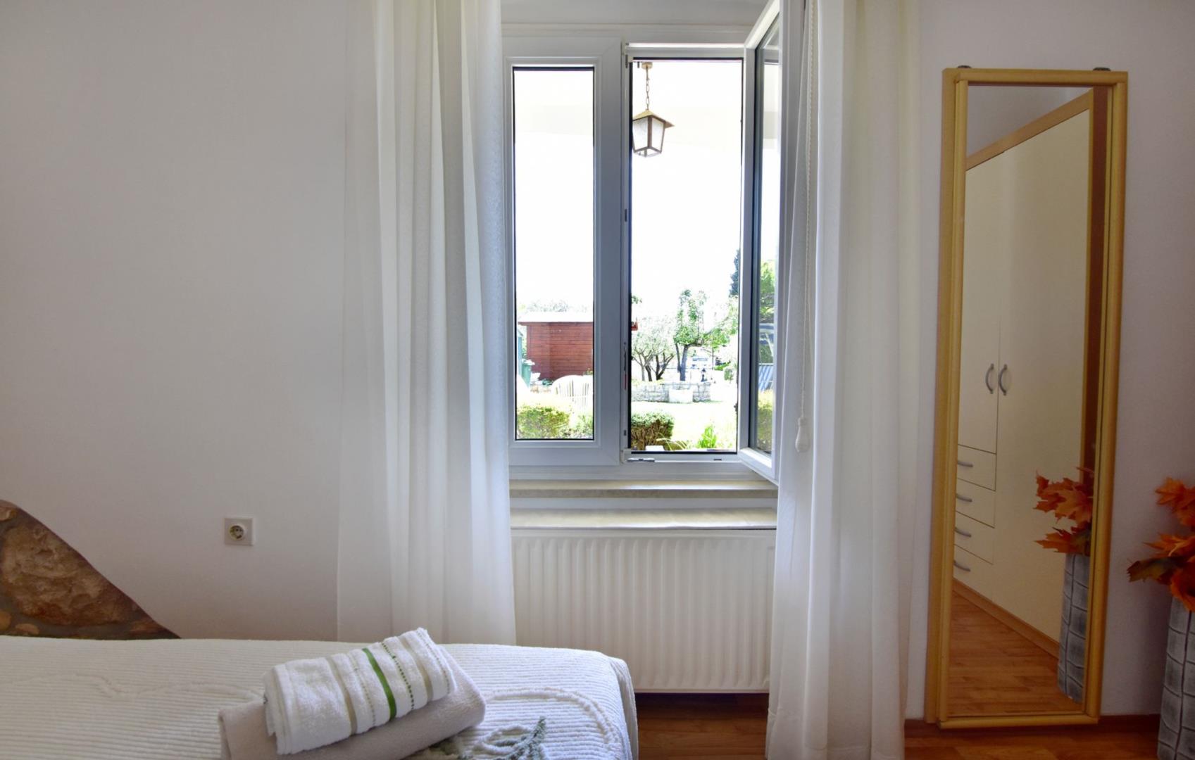 Udoban apartman od 24 m2 smješten u prizemlju obiteljske kuće s prekrasnim velikim ograđenim vrtom za zajedničku upotrebu. Udoban i pažljivo namješten smještaj smješten je u turističkom području Umaga koje su turisti najviše tražili. Područje čini jedinstvenom raznolikošću plaža i obale okružene bujnom mediteranskom vegetacijom bogatom biljkama različitih vrsta zimzelenog grmlja, bora i čempresa. Do kupališta je lako doći pješice za nekoliko minuta. Mjesto je tiho, sunčano, okruženo zelenilom, ali i dalje centralno. Teniski tereni na kojima se već godinama održava poznati umaški ATP Open Croatia teniski turnir na 800 m.